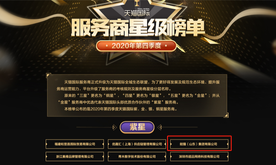 近日,天猫国际2020下半年服务商星级评选结果新鲜出炉,能猫凭借专业优质的服务成功荣获天猫国际最高荣誉"紫星服务商"。