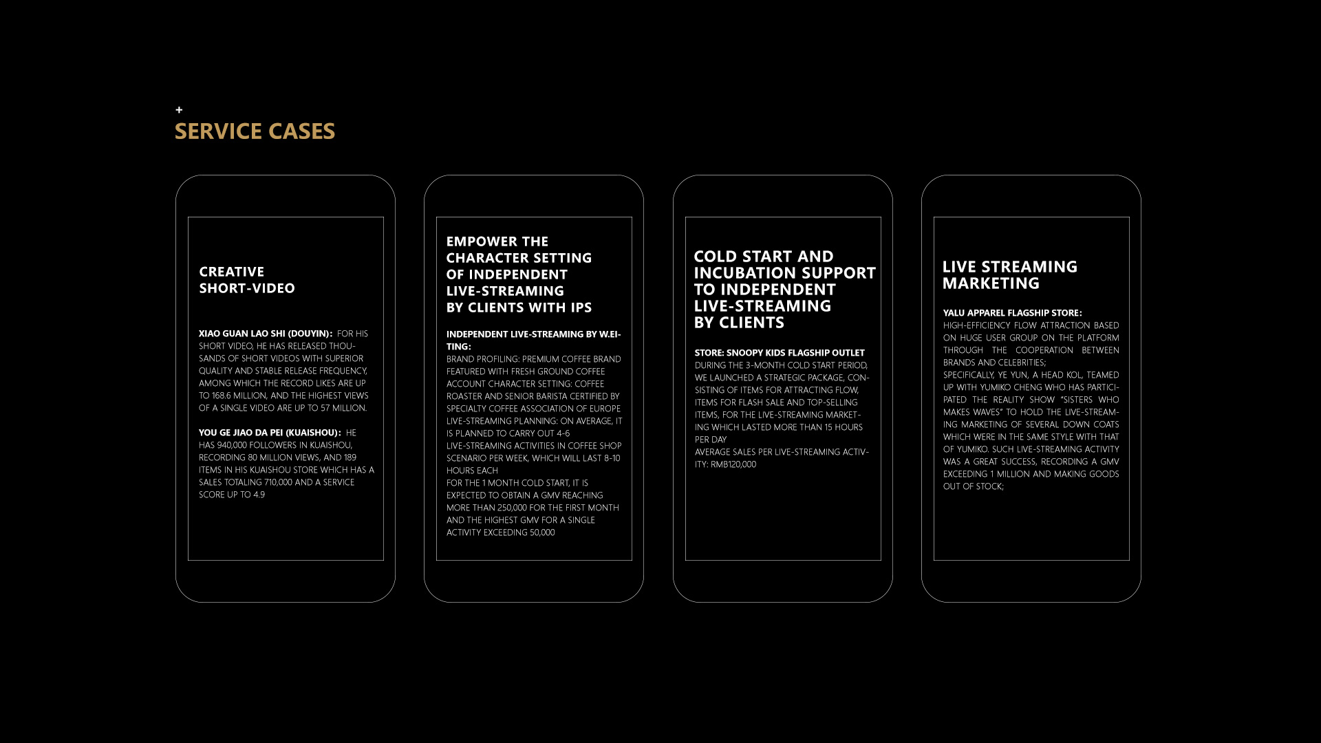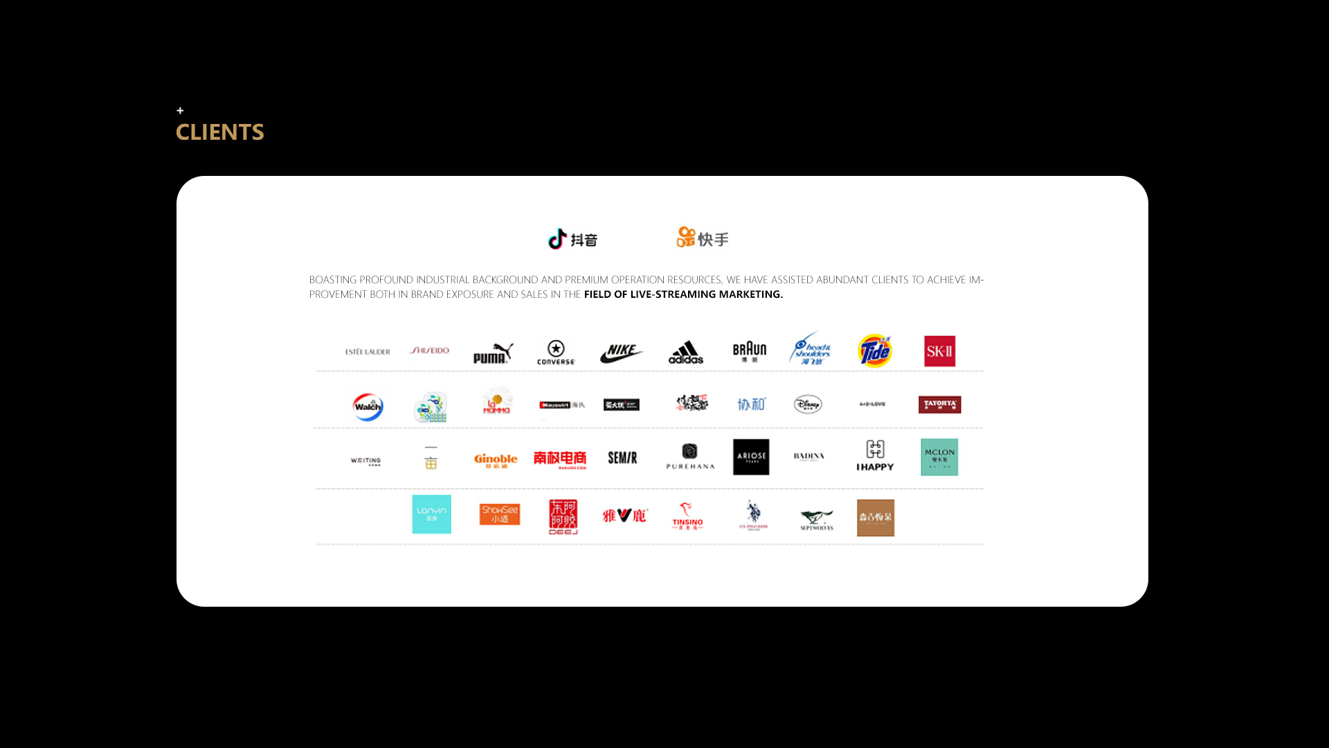 With rich experience in serving more than 80 famous brands worldwide from industries such as apparel, mother & infants, makeup, model & toy, personal care, household supplies and FMCG, we can provide brands with multi-platform store operation services, including store marketing planning, visual creativity, goods management, member operation, digital marketing, logistics and warehouse, and customer service. Our service platforms include Taobao, Tmall, JD, Pinduoduo, vip.com and Kaola. Therefore, we can create an immersive and seamless consumer experience with all-round coverage, and roll out precise marketing and refined operation.